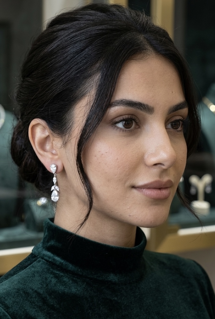 Zarafetin zirvesine davetlisiniz. Pırlantaya en yakın ışıltıyı sunan Mozanit taşların asaletini, üçlü damla tasarımıyla birleştirdik. 925 ayar gümüş üzerine işlenen bu özel tasarım, her hareketinizde ışığı yeniden keşfediyor.